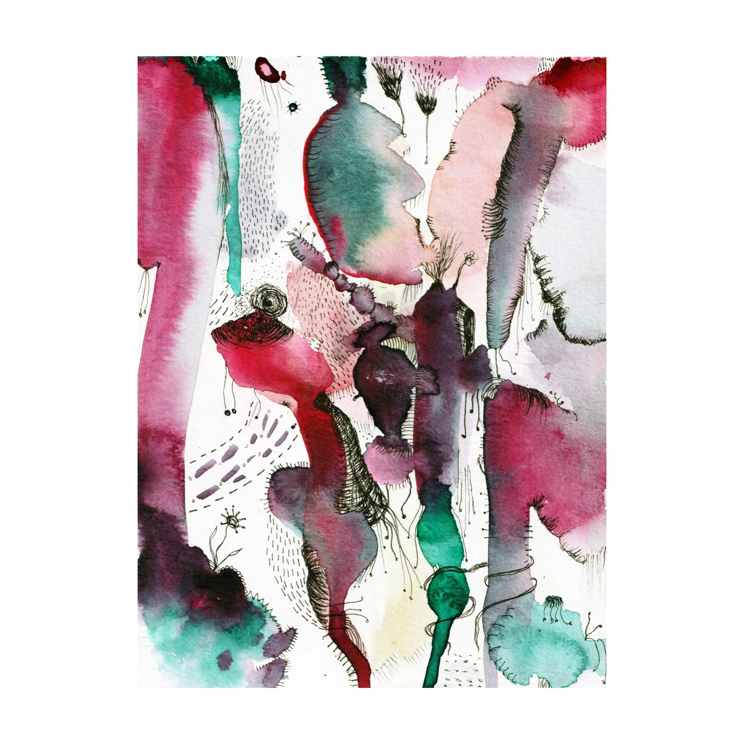 These pieces are an open-ended exploration of color, line, and gesture. Using watercolor, pastel, markers, and pen, I let my hand move without overthinking, more like a dance than a drawing. Each mark is a response to the last, a way to feel rather than plan. The result isn’t the focus. What matters is the process itself: a raw, honest act of expression, where the paper becomes a space to wander, release, and simply be.
